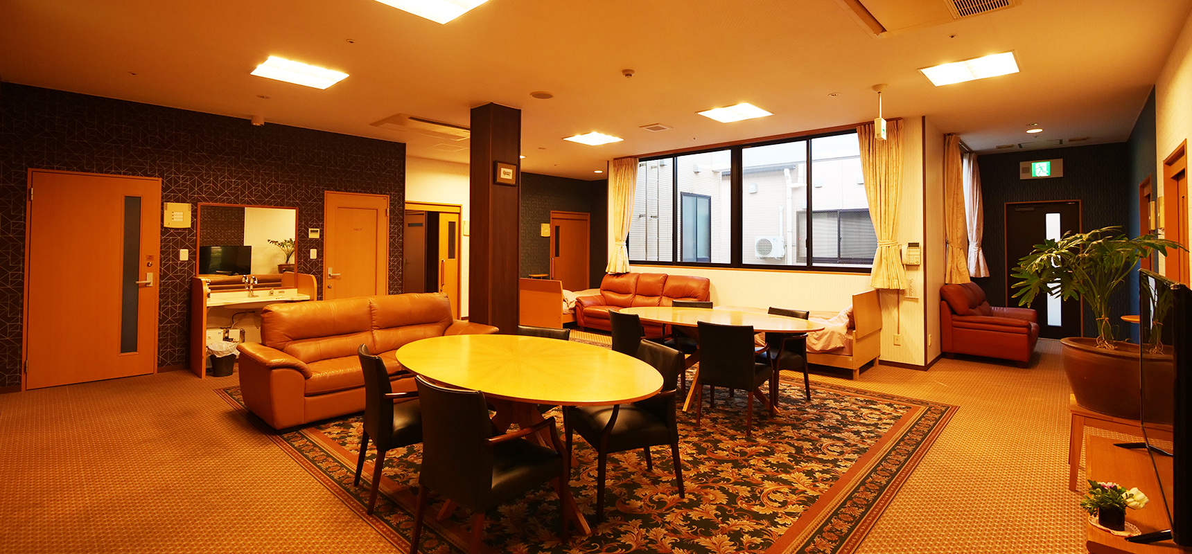 談話コーナー併設の広い食堂兼機能訓練室(大型デジタルTV設置)